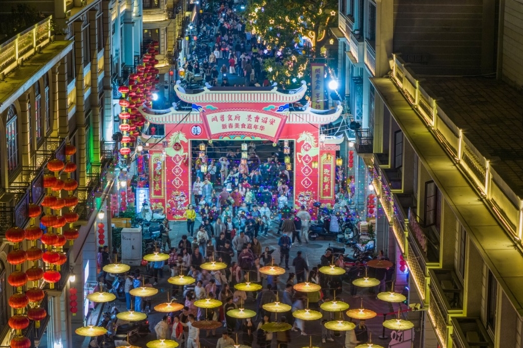 科技启幕、天“马”行空、智领新春。“骐骏巡天”“跳进光影的魔方里”“机甲舞阵闹新春”“骑楼幻境”主题光影秀等表演科技感满满,无人机在夜幕中振翅巡游,光影舞蹈秀构筑立体光影空间,机器人矩阵以精准舞步演绎新春旋律,科技与新春碰撞出别样火花。