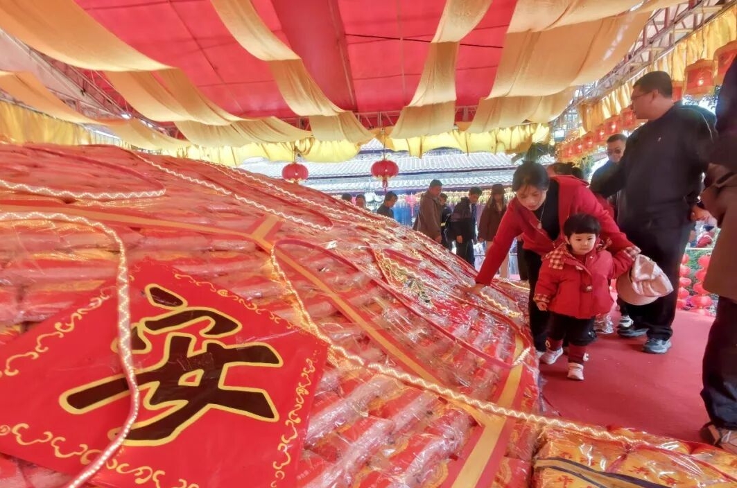 “摸龟头,起大楼;摸龟嘴,大富贵;摸龟尾,有头又有尾……”活动现场,市民游客排起长队,依循传统习俗,有序地顺时针抚摸“米龟”的各个部位,祈盼新的一年国泰民安、风调雨顺、阖家幸福。从浙江回泉州过年的陈先生特意带着孩子前来体验,他激动地说:“20年的老习俗,摸一下这‘大米龟’,感觉年味更浓了,心里也更踏实了。”