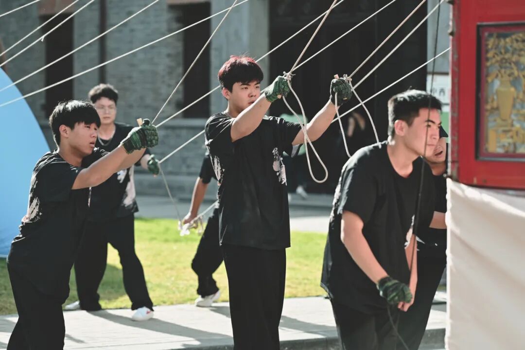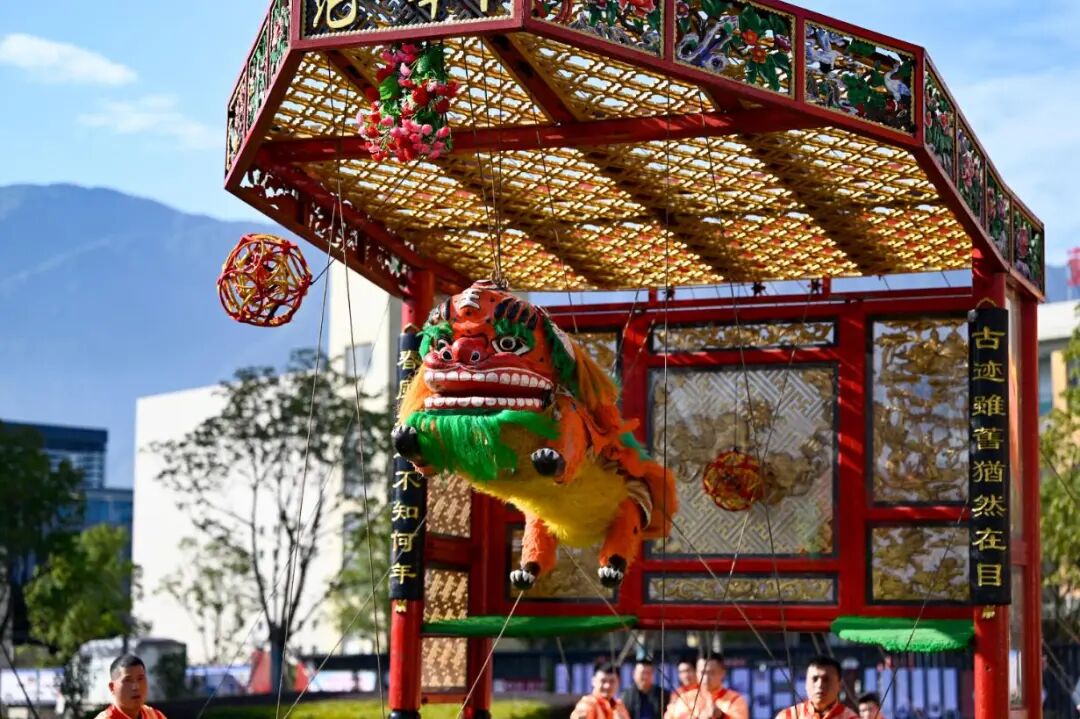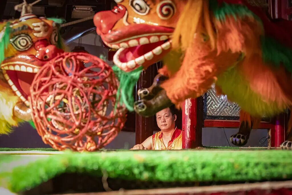 台前,雄狮翻滚扑跃,神气活现。幕后,线狮艺人屏息凝神,牵动丝线。在这根“线”起落间,一头头威风凛凛的线狮在艺人的操控下,蹲卧、腾跃、左右追逐、嬉戏抢球,引得现场游客阵阵喝彩。