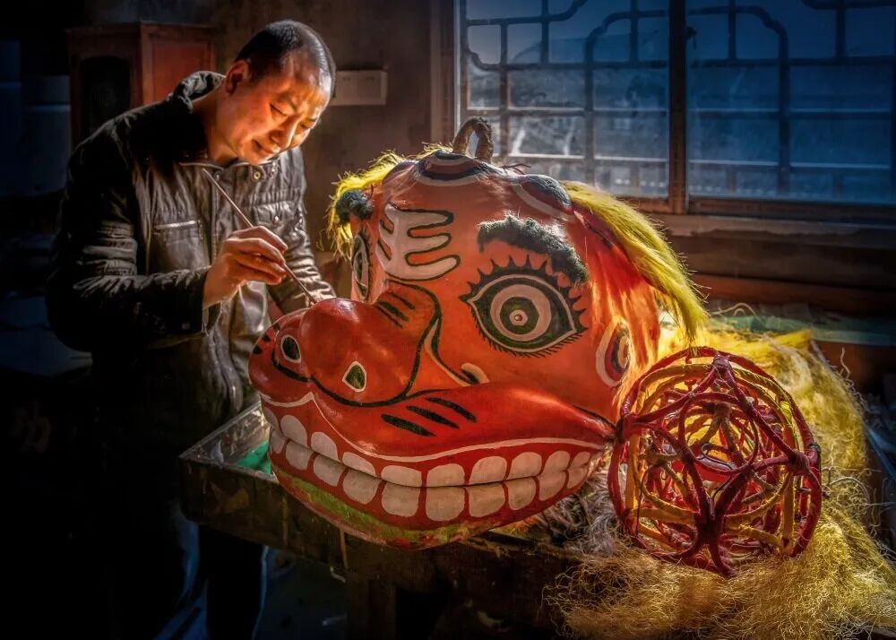 霍童线狮的精妙,藏在制作工艺里。大的线狮重达30多公斤,小的约18公斤,看似笨重,却能在线绳的牵引下做出各种灵活动作,靠的是线狮艺人对材质与结构的精准把控。一只合格的线狮,要历经搭骨架、火烤、填充、定型、上色、装饰等多道工序,狮身骨架以韧性十足的毛竹为料,线狮艺人手工劈篾、塑形,保证骨架经得住反复拉扯;狮身裱糊、彩绘、缝毛,更是细致活,一笔一画勾勒狮纹,一丝一线缝制狮毛……一只线狮往往要耗时一两个月才能完工,每一只都是独一无二的手工珍品。