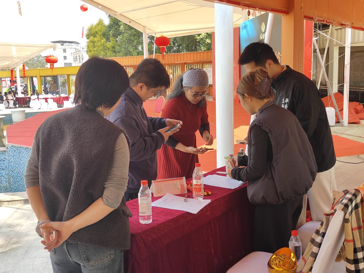 拍品涵盖仰圣山庄、灵龙谷、高峰谷景区住宿券,白芽奇兰茶、文峰柚香菇等特色风物包,新年福禄伴手礼文创摆件,以及招牌药膳汤券。随着主持人报价声起落,台下应价声此起彼伏,有人瞄准时机在减价环节果断出手,也有人一路加价争夺心仪好物。“这种拍法很有意思,跟平常的拍卖完全不一样,像玩游戏一样!”一位来自广东东莞的游客拿着刚拍到的白芽奇兰茶礼盒心满意足地说。压轴登场的两席价值998元的“全茶宴”将现场气氛推向高潮。活动设有专属兑奖台,确保交易便捷高效,并穿插“三马送礼”互动持续提升热度。