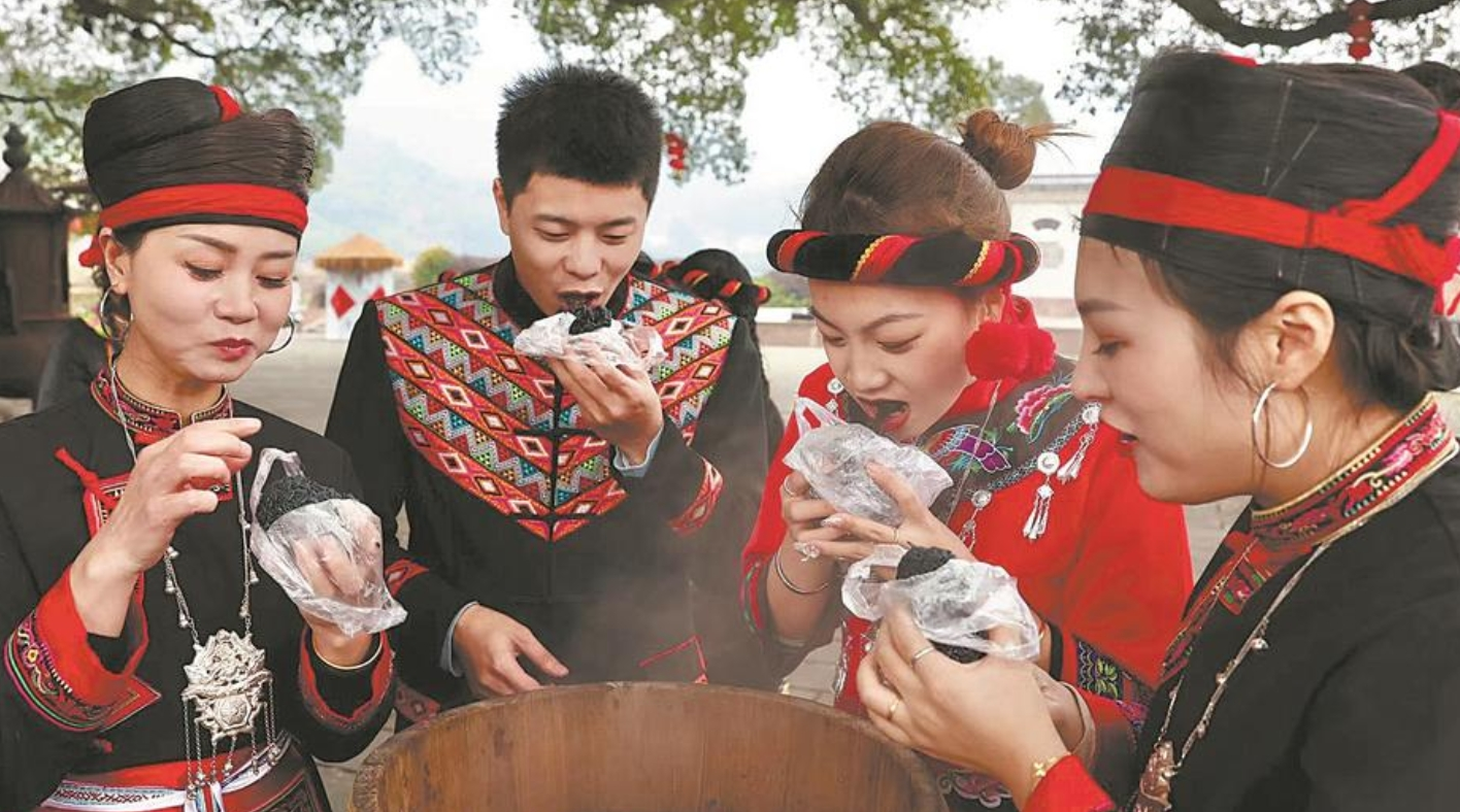 18日,在福安市坂中畲族乡廉岭村,畲族儿女穿上节日盛装,共同品尝畲家乌米饭。