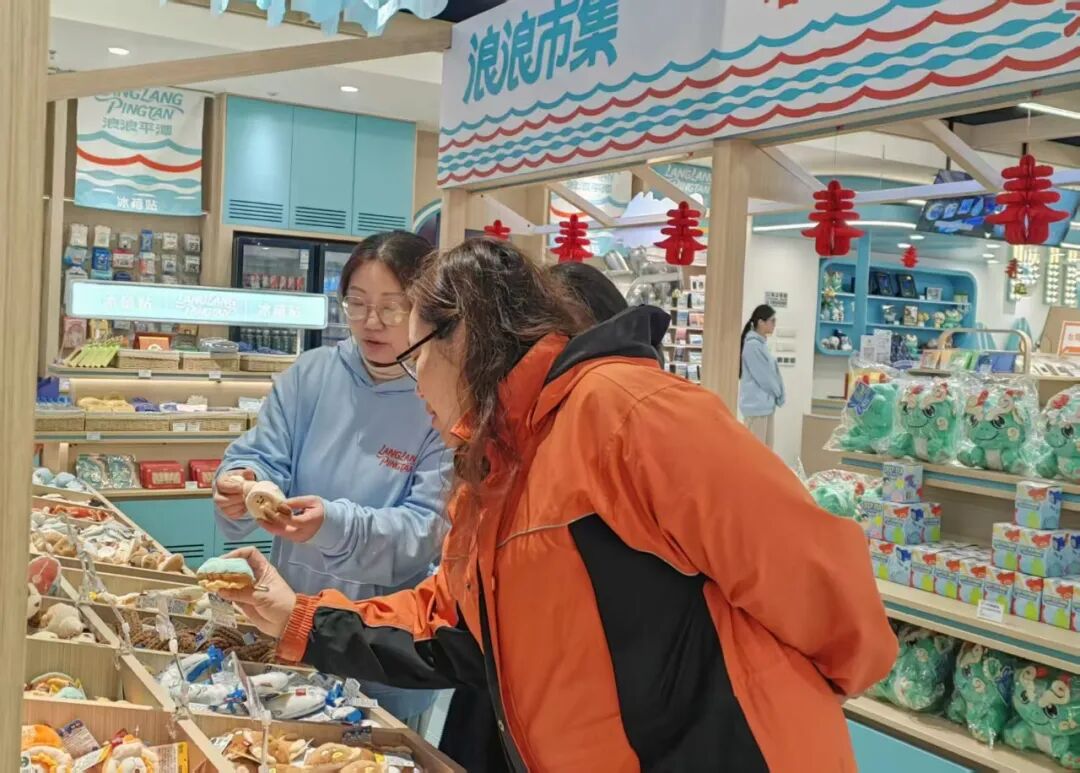 走进台湾小镇浪浪平潭,新春的喜庆气息扑面而来,欢笑声与店铺的热闹音乐交织在一起,摩肩接踵的人群让整个小镇充满生机。平潭有礼文创主题店居于核心位置,门店内外挤满了挑选文创的市民和游客,成了小镇里的 “人气担当”。