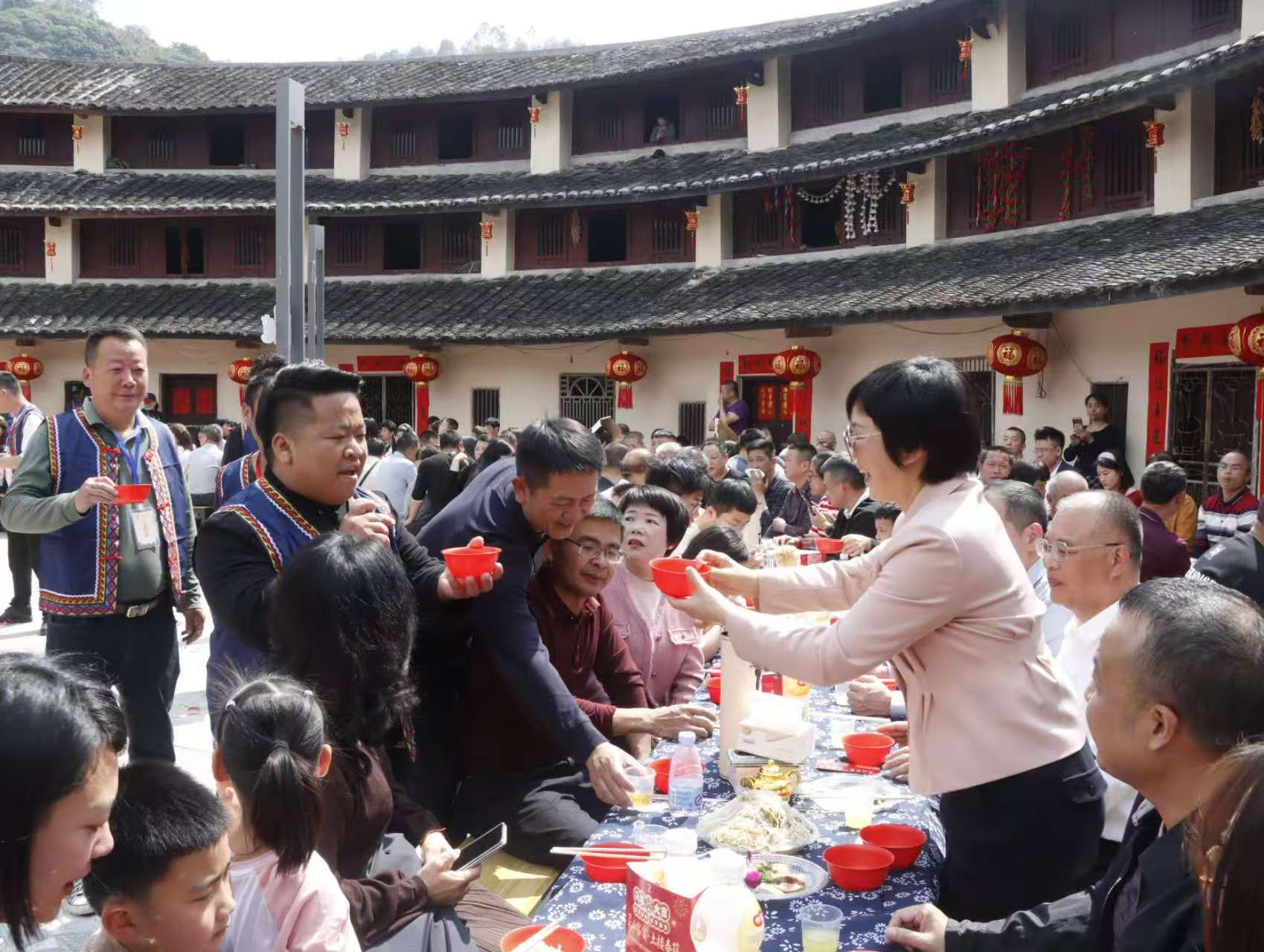 走进土楼,环形长桌沿着土楼内围摆开,绵延108米,68张圆桌依次排开,400余位宾客身着客家蓝衫,围坐共餐。随着一声“开席”,地爆气球腾空而起,彩色飘带洒落席间,掌声与欢呼声在土楼上空久久回荡。