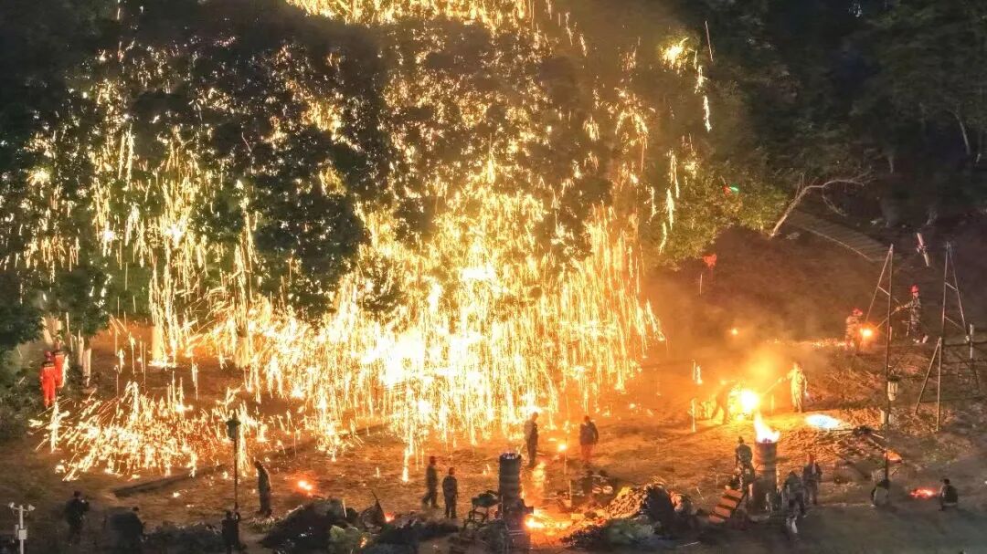 在城厢区绶溪公园,非遗打铁花闪亮登场,“火树银花不夜天”震撼上演,风火轮、火壶等民俗绝技轮番上阵,人潮涌动、欢声雷动。