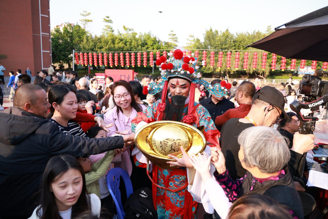 湖头将新春迎财神的仪式感拉满,《迎财神接财神》节目开场便点燃现场氛围。现场张灯结彩,身着红金华服的“财神爷”手持金元宝穿梭人群,派发福礼、与观众亲密互动,孩子们追跑嬉戏,老人们笑迎福气,热闹非凡。现场还特设财神打卡装置,拍照的观众排起长队,锣鼓声、歌声、欢笑声交织,勾勒出“迎财神、听乡音、品年味”的乡村新春画卷。