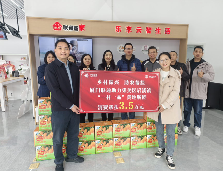 走进数村,厦门联通乡村振兴、助农帮扶走进集美区“一村一品”特色产业,积极响应地方帮扶号召,定向采购集美黄地村脐橙3.5万元,以消费帮扶之力为黄地村特色产业发展注入强劲动能。