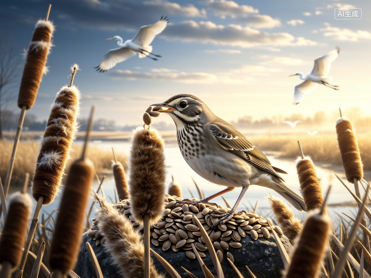 斑文鸟体型小巧,通体褐色布满细碎白斑,是典型的“社群鸟”,常常8—30只成群活动,偶尔甚至上百只“集团军”出动,啄食草籽时的模样,宛如微型“集体收割机”。它们对栖息地极为挑剔,而闽江河口湿地的芦苇荡、滩涂与温润气候,恰好契合了它们的生存需求。这里不仅有充足的芦苇果实、草籽作为食物,更有洁净的水域与茂密的植被作为栖息庇护所。