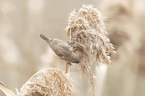 斑文鸟啄食芦苇 闽江河口湿地藏着春日生机