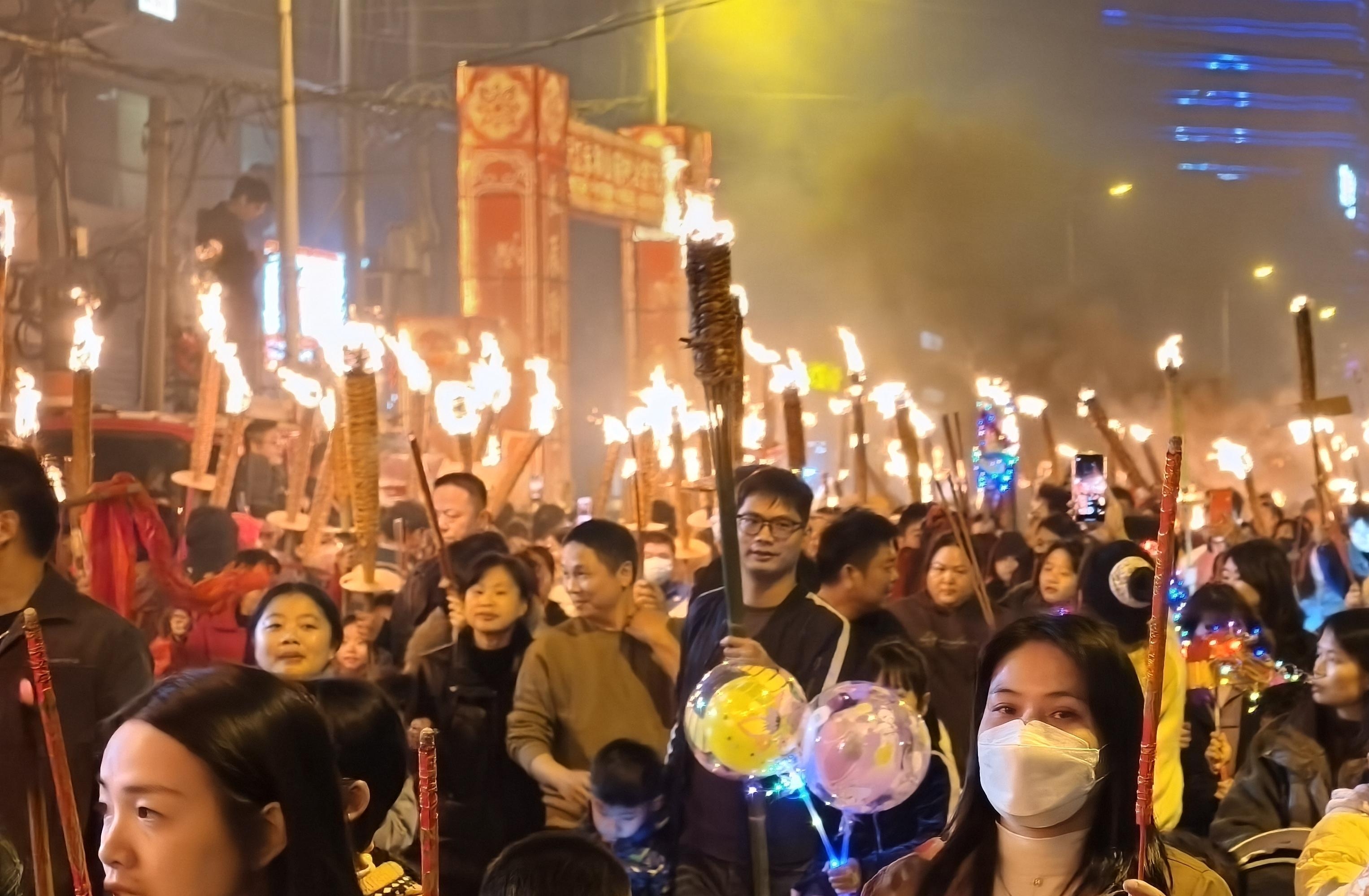 入夜,山前村洋溢着喜庆祥和的氛围,人们从四面八方欢聚世泉宫广场。19时40分许,火种点燃,人们依次引燃手中的火把,场面一片欢腾。随后,大家手持火把有序列队前行,在环村道路上巡游。俯瞰队伍,宛如一条巨大的“火龙”,场面颇为壮观。一路上,大家互道平安、祈福纳祥,希望与温暖在火光中跳跃。火光映照不夜天,也将这个春节装点得格外红火。