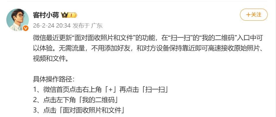 2月24日,微信员工@客村小蒋 发文称,微信最近更新