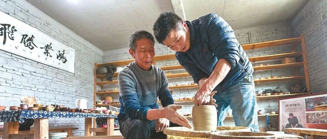 肖永灿和父亲一起研究创作新的硋器作品 刘志玮 摄