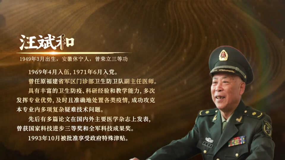 汪斌和,福州市铜盘军休所军休干部,安徽休宁人,1949年3月生,1969年4月入伍,1971年6月入党,原福建省军区门诊部卫生防卫队副主任医师。具有丰富的卫生防疫、科研经验和教学能力,多次发挥专业优势,及时且准确地处置各类疫情,成功攻克本专业内多项复杂疑难技术问题。先后有多篇论文在国内外主要医学杂志上发表,曾获国家科技进步三等奖和全军科技成果奖,1993年10月被批准享受国务院政府特殊津贴。