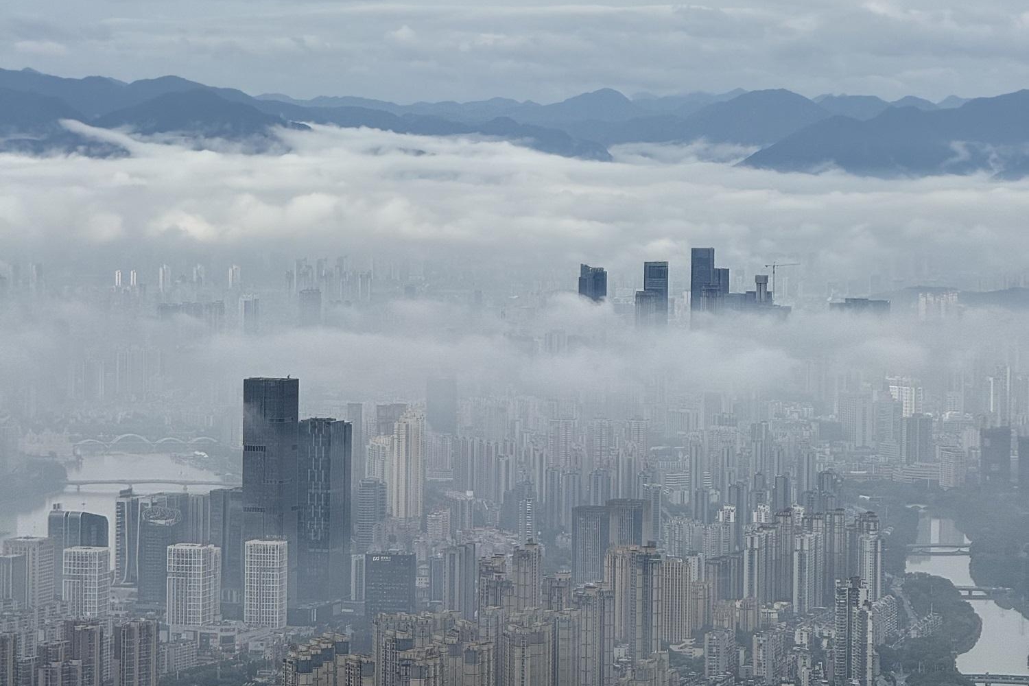 群山、高楼若隐若现,高处俯瞰宛若仙境……27日,受华南准静止锋影响,福州部分地区出现锋面雾现象。