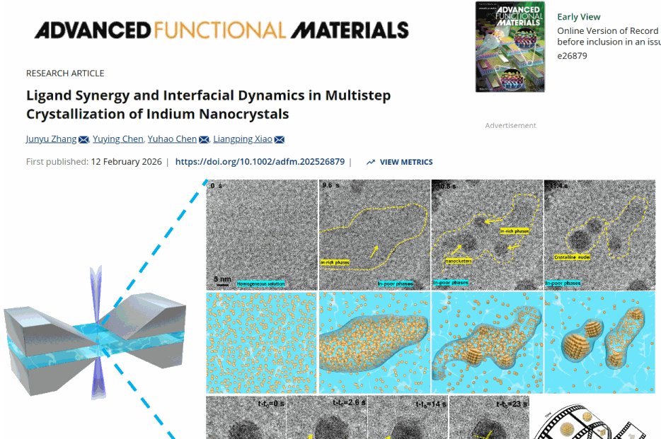 该研究工作运用原子级分辨率的液相原位透射电镜技术,对铟纳米晶体在溶液中多步结晶全过程进行了实时动态追踪。通过扫描透射电镜(STEM)成像与电子能量损失谱(EELS)分析,研究团队在原子尺度上揭示了液体环境中纳米晶体“晶核非晶界面层”核壳结构的形成特征,并检测到界面区域存在氧相关物种。这一结果为理解金属纳米晶体的界面演化提供了关键证据。