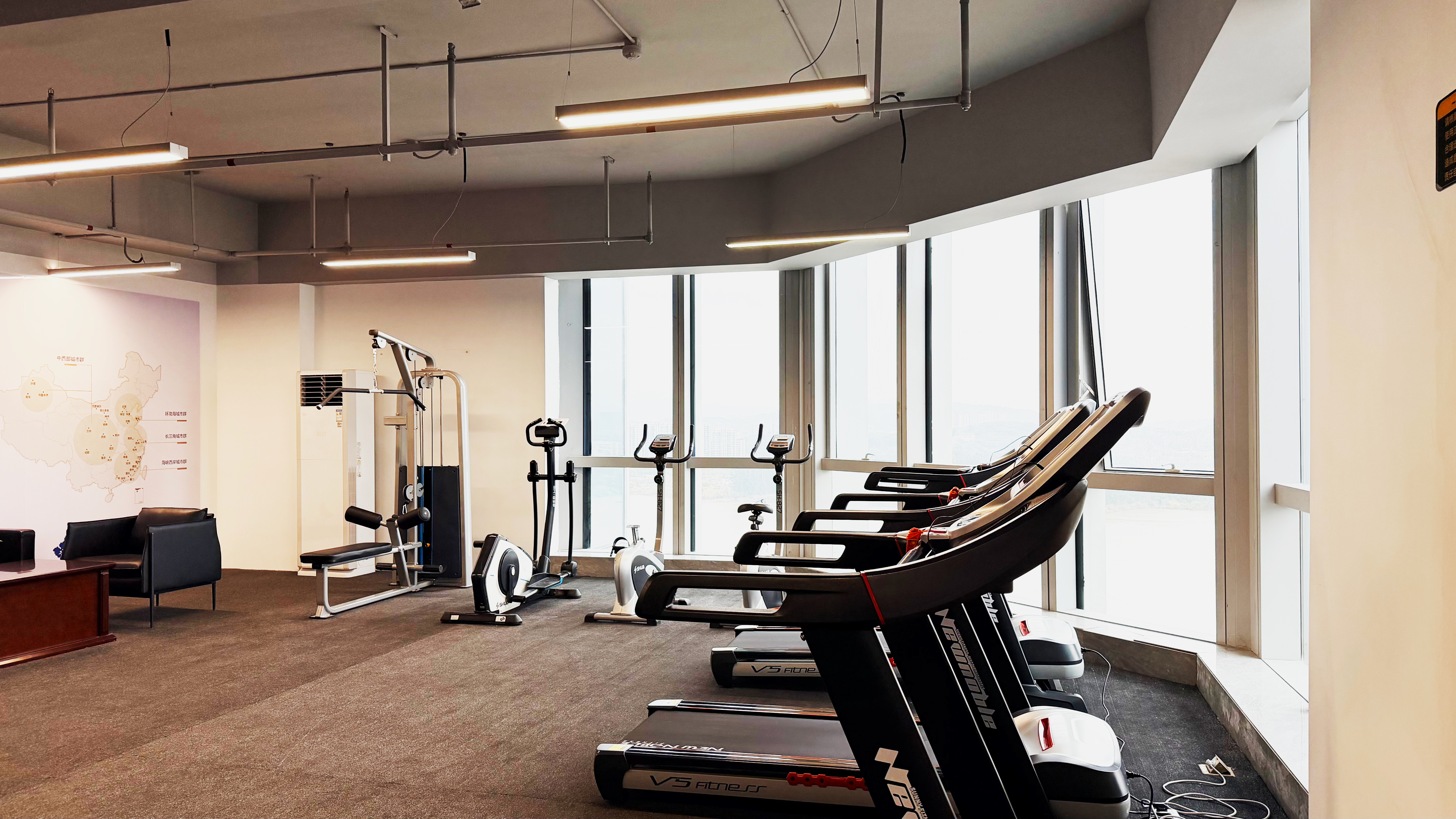 能量补给站配备乒乓球桌、跑步机、动感单车、综合器械健身器以及哑铃等常用健身器材,为职工提供科学锻炼的场所;公益图书角陈列着各类书籍与期刊,既是午休时小憩的“充电站”,也是同事间激发灵感的“思想角”;休闲区则设置了茶歇桌椅,为职工提供放松交流的空间。