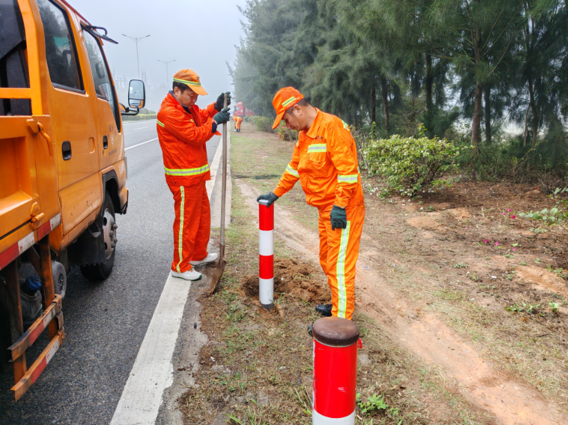 当日,天刚朦朦亮,养护人员便已踏上巡查之路。在G357线K5+935陈城镇湖塘村路段左侧,养护人员发现数根道口桩被车辆剐蹭发生倾倒变形,影响夜间行车安全。见状,沈添福站长组织职工们一齐对受损的桩体进行扶正加固,并仔细擦拭桩体灰尘,沿线的安全标识重新变得醒目起来。