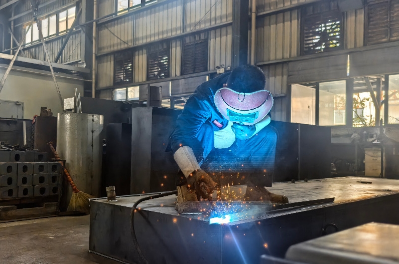 福建奥斯福电力系统有限公司生产车间内,工作人员正在进行焊接工作。郑晓梅摄