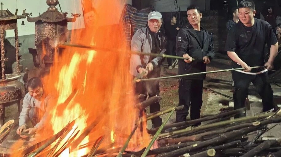 由一位壮汉从火堆中抽出一根竹子挥舞