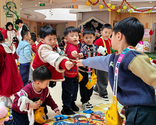 福幼象园廊道间、天井中四处挂满了琳琅满目的璀璨花灯,孩子们穿梭于园内互相赏灯、问候,送上新春祝福,点点灯火映照张张笑脸。离园时分,更有亲子猜灯谜活动智趣横生,家长与孩子共赏花灯、竞猜谜面,兑换礼物,其乐融融。