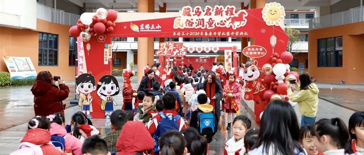 在东侨开发区第三小学,校领导与老师们早早守候在校门口,为每一位返校学子发放“福签”,送上新学期祝福。学生们积极参与“跃撞吉祥”“五谷纳福”“爆竹迎新”等活动,现场欢声笑语不断。随后,开学典礼以直播形式进行,法制副校长讲授法治第一课,校长则以“马年逐光,笃行致远”为主题,讲解“三马精神”,鼓励学生在课堂上蹄疾步稳、在集体中团结互助、在挑战中一马当先。