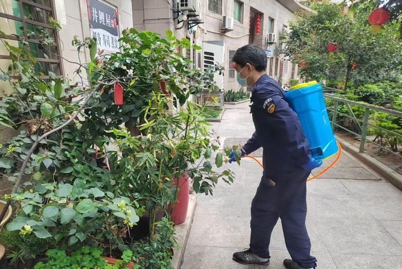 昨日上午,丰泽街道源淮社区晋兴华庭小区内,物业工作人员开展越冬蚊统一消杀行动。消杀人员身背电动喷洒设备,沿着小区道路缓步推进,对绿化带、楼道拐角、快递货架、垃圾桶周边等蚊虫易滋生区域进行全覆盖喷洒。他们针对下水管道投放杀虫药剂,在楼顶天台逐一排查角落积水,清理落叶杂物,将闲置瓶罐倒扣放置,同时对地面假山景观池挖掏淤泥、排空积水并清扫落叶。