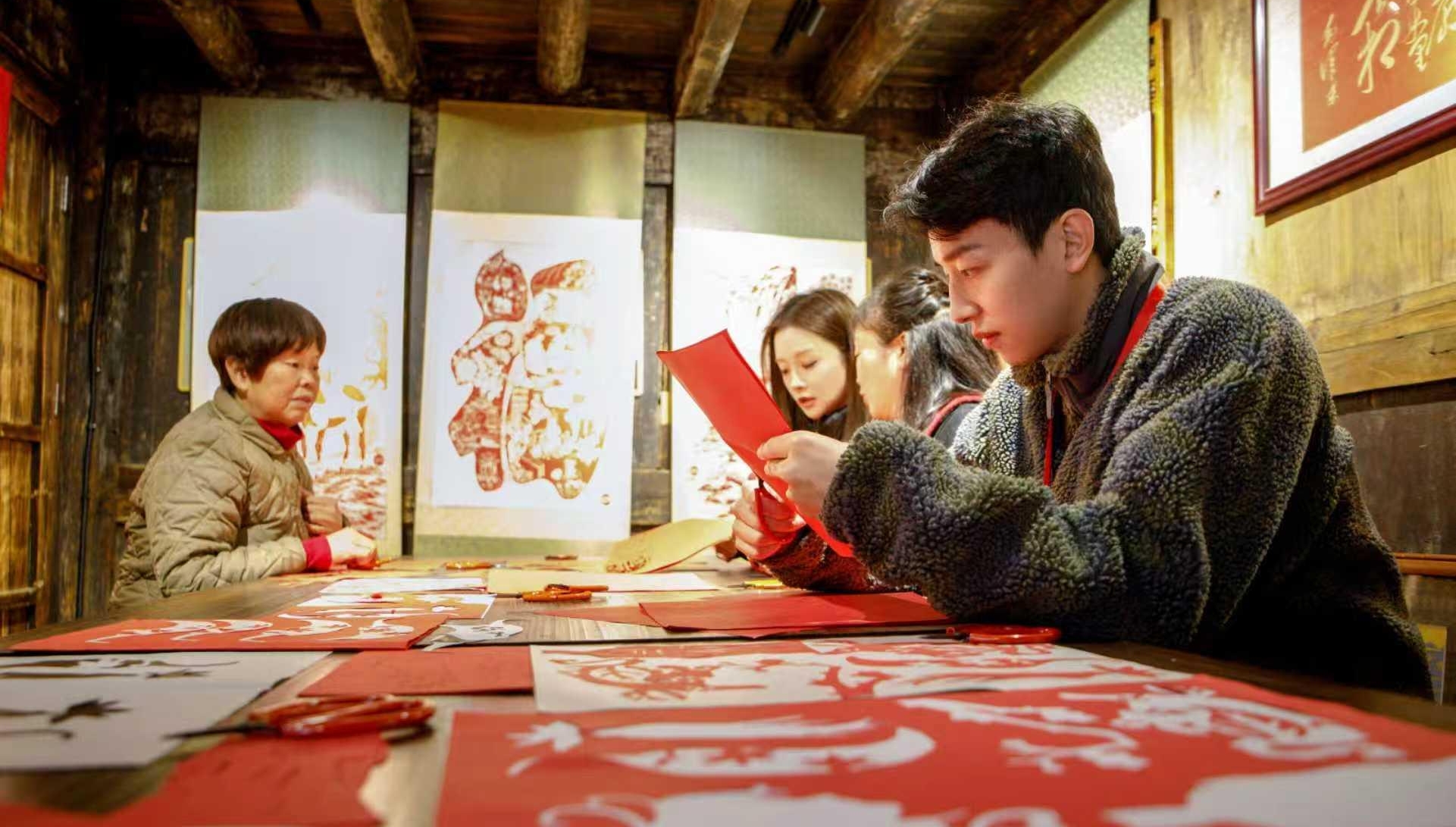 网络达人们体验柘荣剪纸 魏迎杰摄