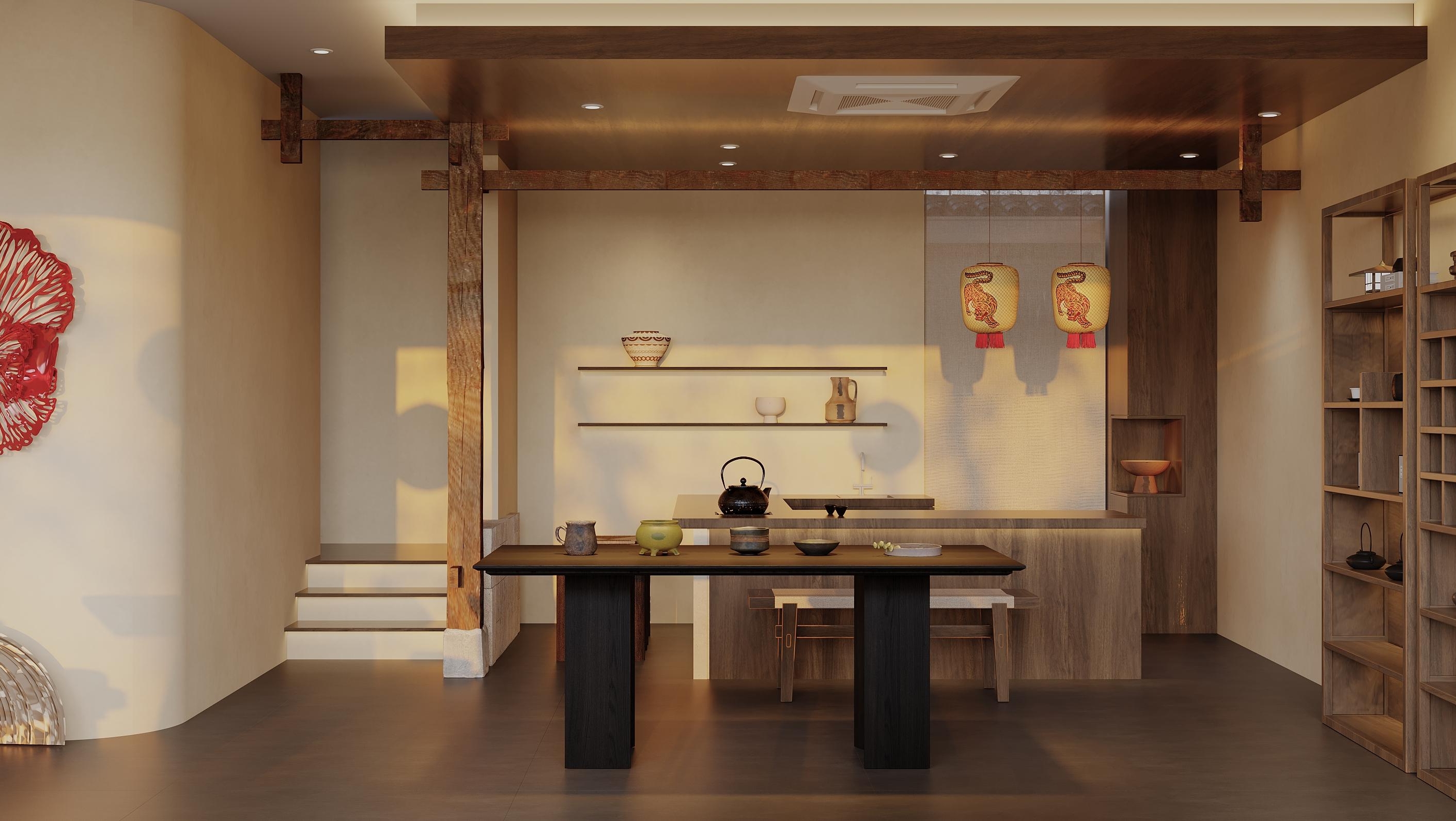 茶桌都是实木的,带着天然的纹路和结疤。没被过度打磨的木面,像生活本来该有的样子——不用太完美,但要真实。坐在桌前,手边是粗粗的陶制茶具,指尖碰到的不是滑腻,是泥土烧过之后的温厚粗糙,那种触感让人想起小时候在外婆家喝茶用的老碗。