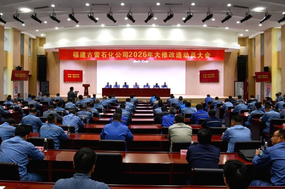 福建日报·新福建客户端3月6日讯 (通讯员 林艺昭 王晨枫 苏哲 邱丽平/文 苏哲/图) 3月4日,福建古雷石化有限公司召开2026年大修改造动员大会,全面部署首次全厂停工大修任务,动员全体参战人员,统一思想、凝聚共识、振奋精神,以决战决胜的姿态投身大修攻坚战,奋力夺取大修改造的全面胜利。