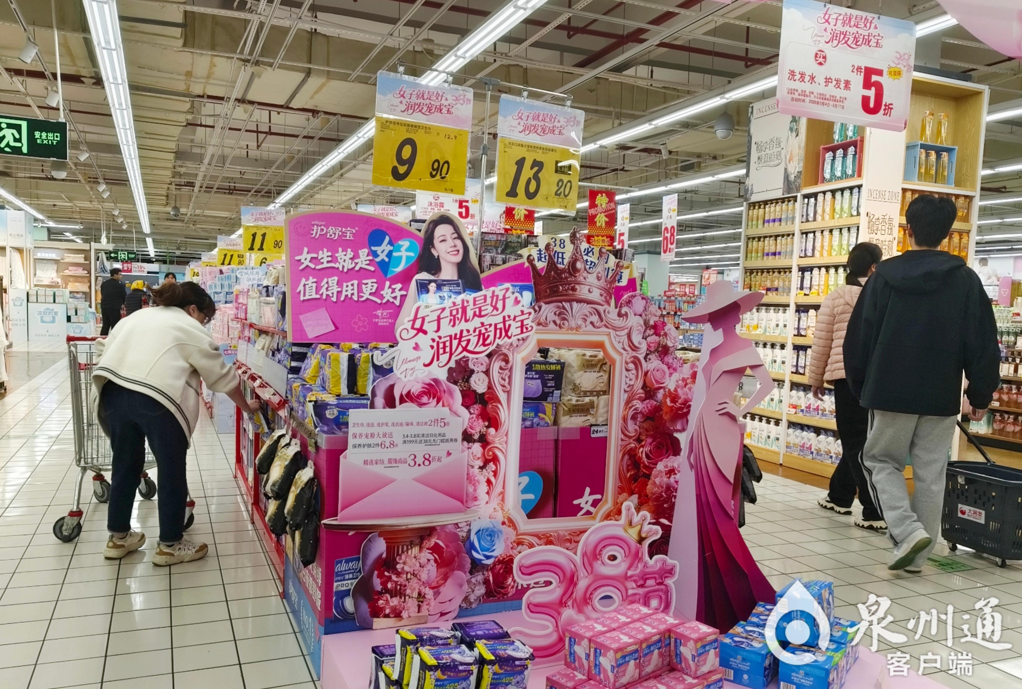 与此同时,日常消费领域也洋溢着节日的热度。在位于安吉路的大润发超市,粉色的宣传海报点缀着卖场,营造出温馨的购物氛围。个人洗护、家庭清洁等日用品,作为女性日常消费的“基本盘”,在“两件五折”“满199元赠38元抵用券”等促销活动的加持下,吸引了不少精打细算的消费者前来“囤货”。