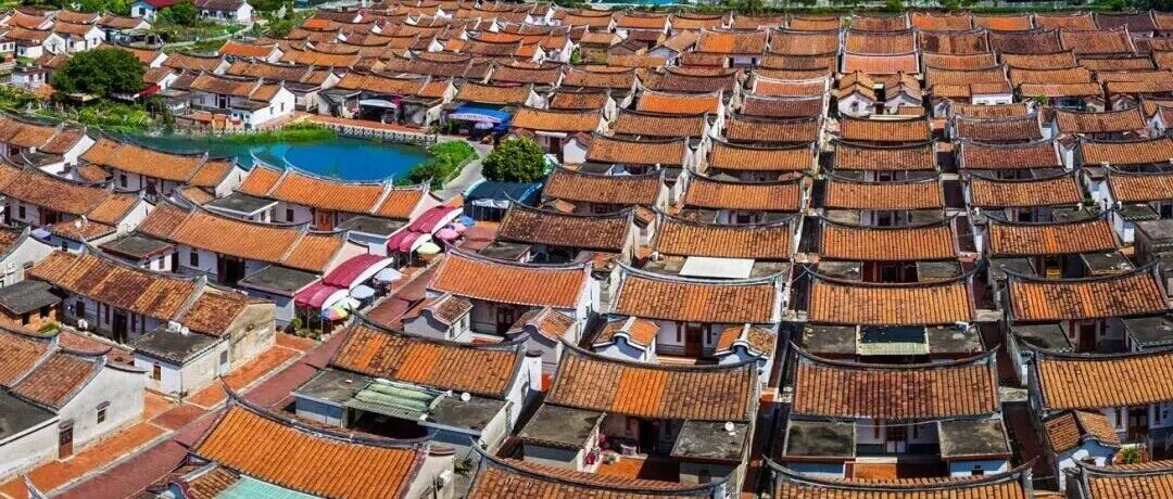 270多座民居按“九宫”格局横竖整齐划一,房屋的格局、形态、大小几乎一致。硬山式燕尾脊形成的一条弧线柔和地伸向天际,宛若一个个音符,在岁月中吟唱着和谐之曲。正是黄昏,晚霞辉映在红红的砖墙上,更添了村落的静谧。
