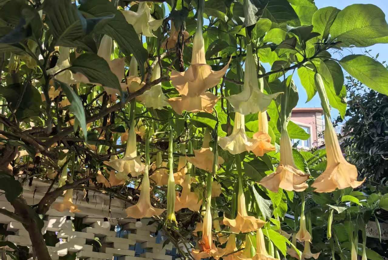 在华新路一家咖啡店门口,几株曼陀罗花长势旺盛,金黄色的花朵像一个个倒立的小喇叭垂吊于枝头,在阳光下随风摇曳,吸引不少市民游客驻足观赏。
