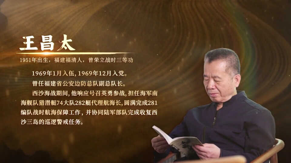 王昌太,福州市崎上军休所军休干部,福建福清人,1951年出生,1969年1月入伍,1969年12月入党。曾任福建省公安边防总队副总队长。西沙海战期间,他响应号召英勇参战,担任海军南海舰队猎潜艇74大队282艇代理航海长,圆满完成281编队战时航海保障工作,并协同陆军部队完成收复西沙三岛的巡逻警戒任务,荣立三等功。