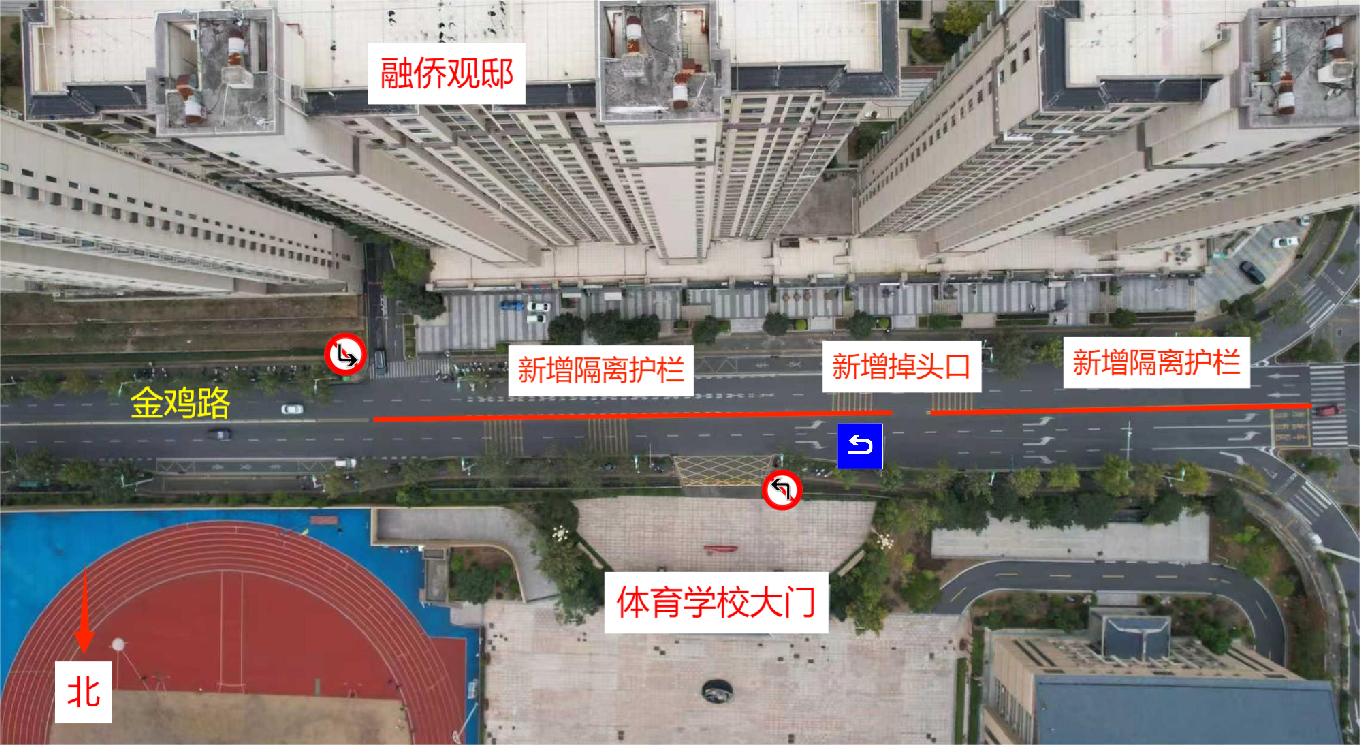 (二)2.金鸡路融侨观邸小区公交站台路段新增单向掉头口,仅允许由东向西方向行驶的车辆掉头。