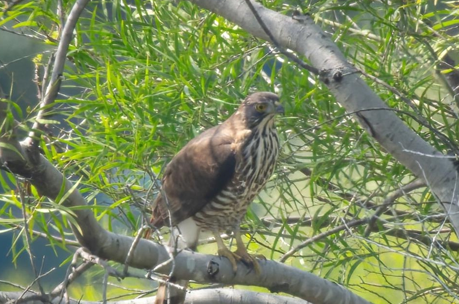 据悉,凤头鹰体长30至46厘米,雌鸟体型略大于雄鸟。它头部呈暗褐色,头顶有短而通常低伏的凤头状冠羽;上体暗褐色,下体为白色并带有橙褐色条纹,胸部有深色条纹,腹部和胁部则分布着棕色至栗色横斑。飞行时,凤头鹰呈现“慢拍翅、直滑翔”的典型特征,尾部可见明显的白色羽簇。