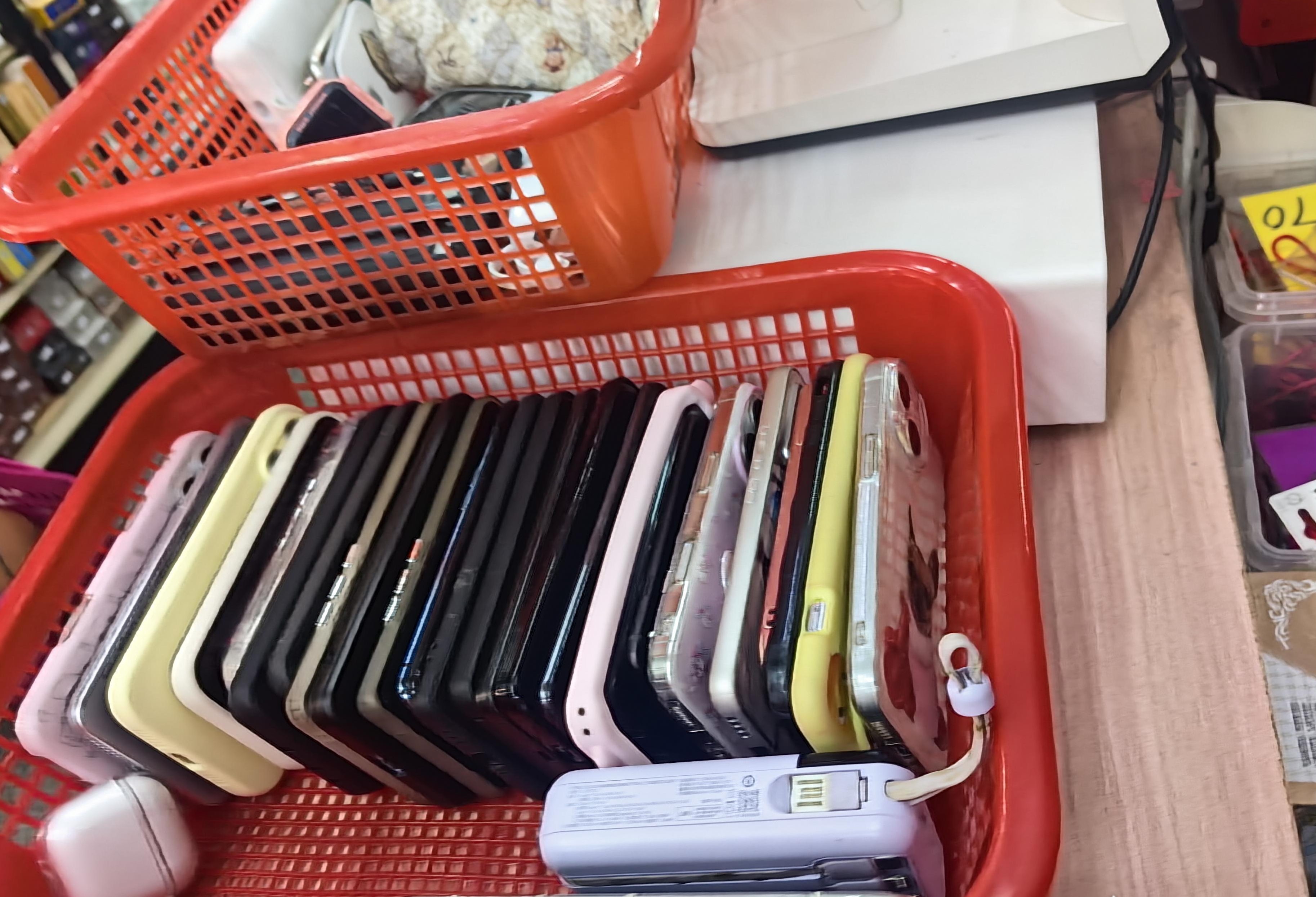 昨日上午11时30分许,记者走访泉州六中附近一家超市时发现,收银台边的两个收纳篮里,整齐码放着约20部手机,此外还有充电宝、电话手表、无线耳机等电子产品。