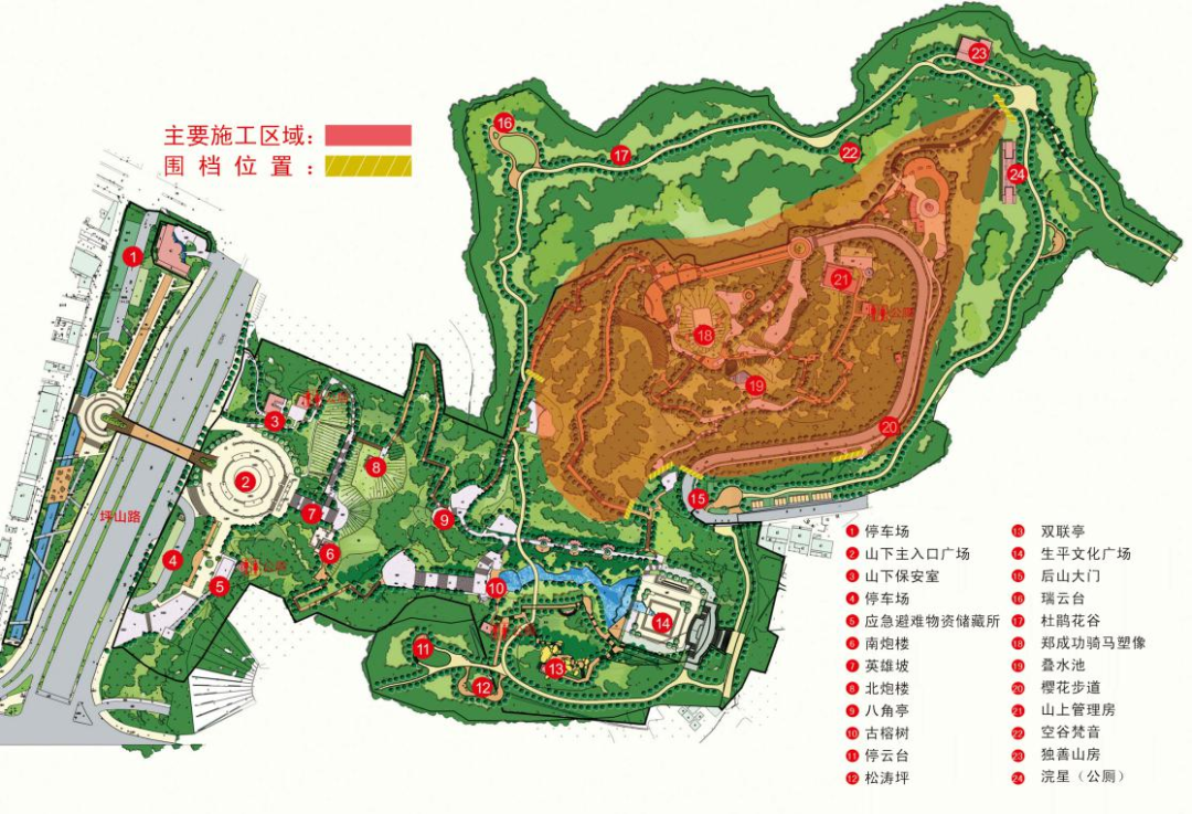 本次施工范围以现场施工示意图标注红色区域为准。施工期间,“郑成功雕像”景点及其周边区域将全面封闭,设置围挡,严禁非施工人员进入。