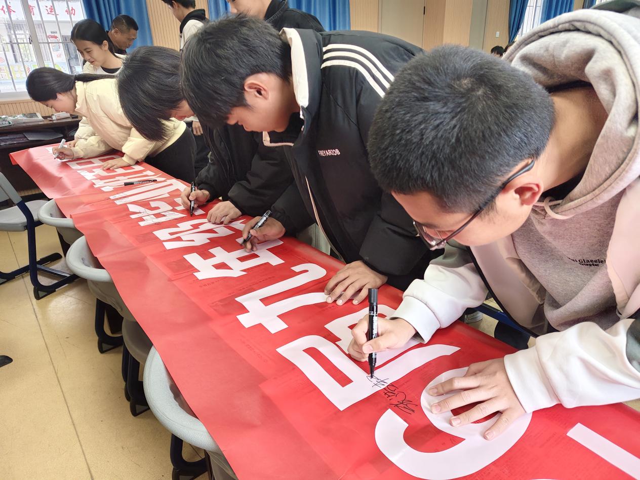 大会尾声,学生们纷纷在印有“毕业班百日”的红色条幅上郑重签名。一笔一画,写下的是名字,更是与百日后自己的约定。九年磨一剑,六月试锋芒。愿文峰学子以梦为马,以笔为剑,在这个夏天奔赴山海、顶峰相见。