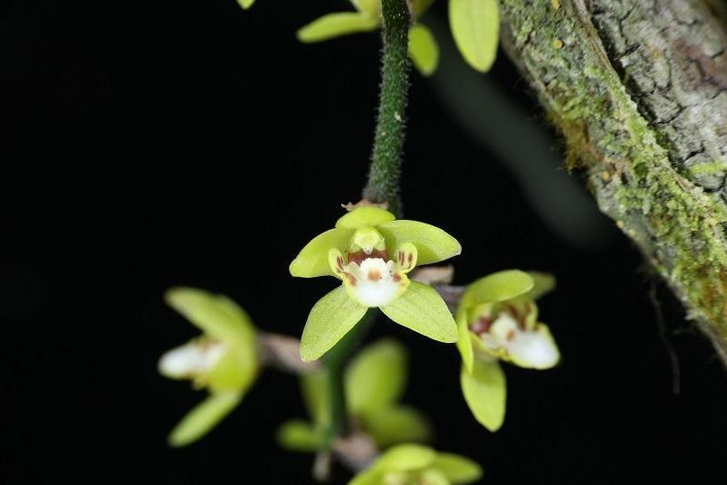 据介绍,广东异型兰,被列入《中国生物多样性红色名录》(2002)极危(CR),CITES附录II。是兰科中极具代表性的附生开花植物,因植株小巧、花色别致,宛若藏于林间的“小精灵”。该物种茎极短,无叶,依靠许多扁平且长而弯曲的根附着于树干生长;花期为3—4月,果期6—8月,开花时会抽出1—2个下垂的总状花序,疏生数朵黄色小花。其原生境为山地常绿阔叶林中的树干上,对生长环境的湿度、植被群落等条件要求严苛,无法在恶劣环境中存活,因此也成为衡量区域生态环境多样性与稳定性的重要指示物种。