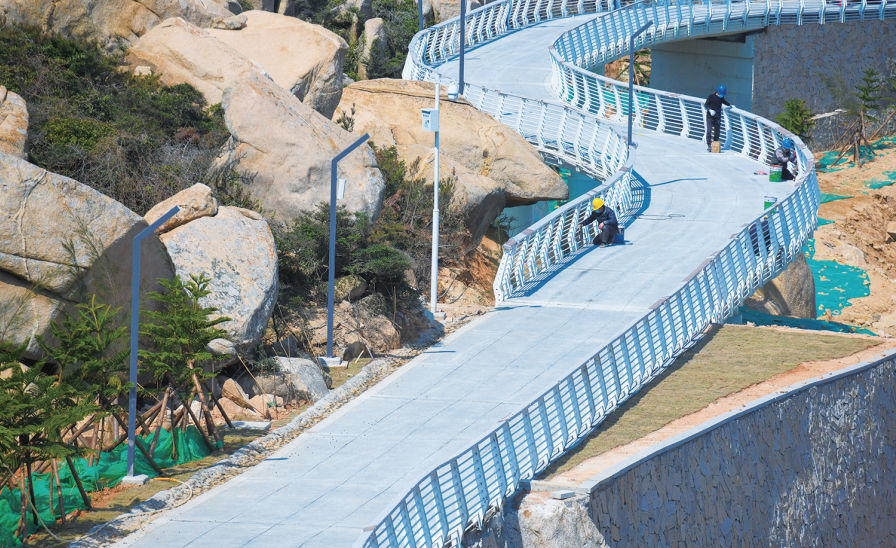 记者在项目现场看到,一条崭新的游步道串联起山海之间的绝美景致,工人们正在进行栏杆修补和照明调试工作。