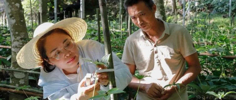 科技特派员苏海兰(左)在光泽中药材母本培育基地察看作物生长情况。(资料图片)