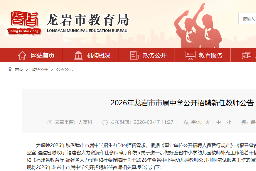 计划招聘人数146名,其中:中学教师132名(含新罗生源2026届福建省公费师范毕业生1名、台湾籍教师1名);小学教师11名(新罗生源2026届福建省公费师范毕业生);幼儿园教师1名(新罗生源2026届福建省公费师范毕业生);新罗区支教专门岗位2名(“三支一扶”计划)。