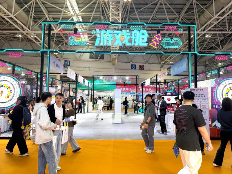 文化出海展区的游戏舱内,大成互娱的大型游戏设备吸引不少人前来体验,腾讯游戏、三七互娱等知名游戏公司开设专属体验区,这是广东省游戏产业协会首次带着国产游戏IP来到福州参加跨境电商类型的展会。