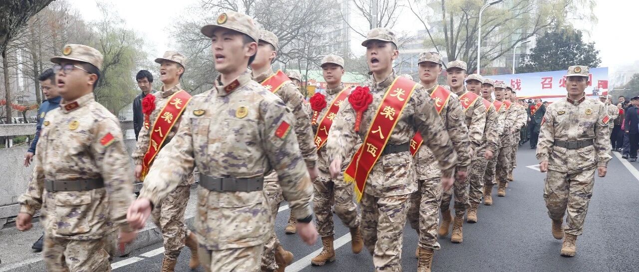 上午11时,欢送仪式在激昂的军歌声中拉开帷幕。新兵们身着戎装、肩披绶带,精神抖擞地通过“从戎门”。
