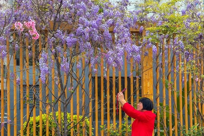 紫藤花开吸引游人驻足打卡。记者 包华 摄