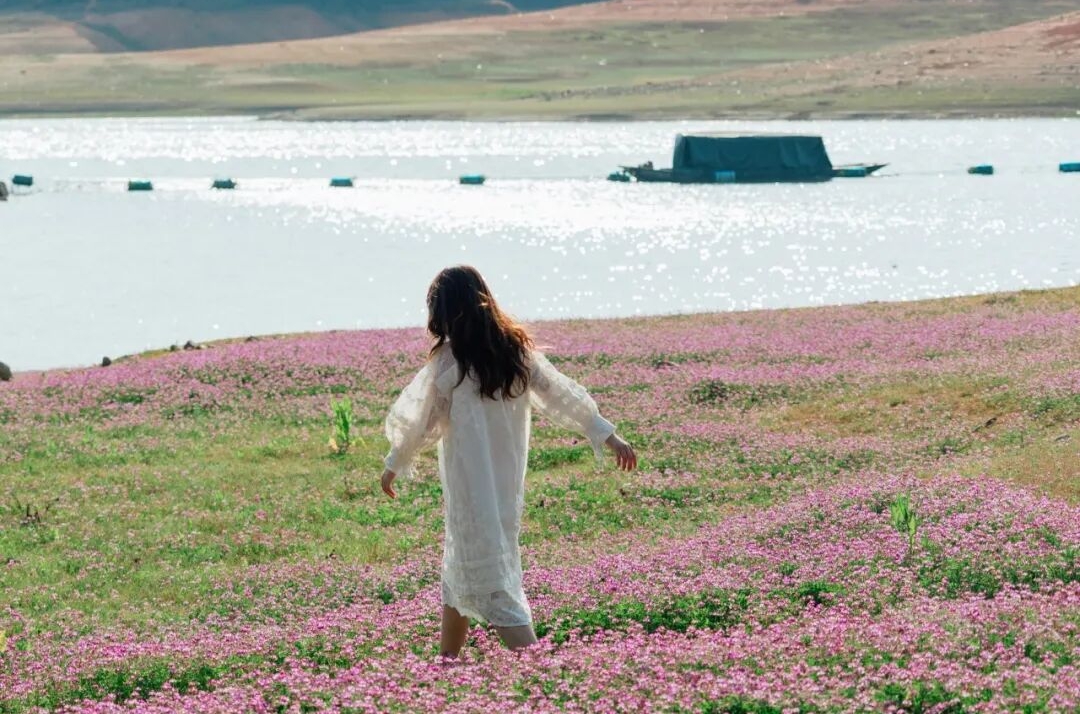 一到达凤冲村,就被惊艳!何必远赴新疆,翠屏湖畔草甸超大片!粉紫色小花铺满草地,像撒了满地的浪漫星云,湖边微风一吹,花浪轻轻晃,随手拍都是“塞上江南”既视感!