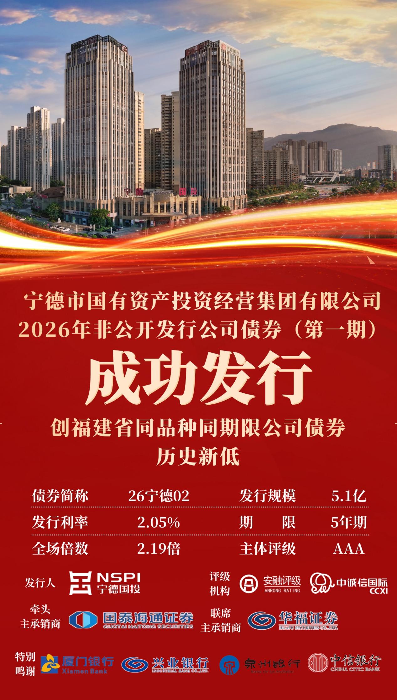 新福建新闻客户端3月21日讯 近日,宁德市国有资产投资经营集团有限公司2026年度第一期私募公司债券成功发行,实现新年融资工作“开门红”。募集资金5.1亿元,期限5年,票面利率2.05%,全场倍数2.19倍,创福建省同品种同期限公司债券历史新低。