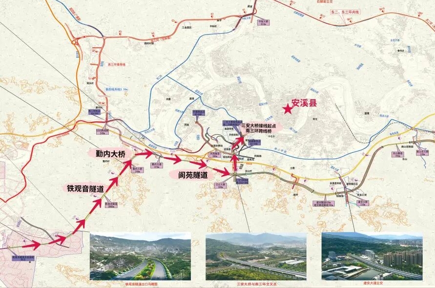 据介绍,国道G358线安溪城厢至官桥段是完善安溪县区域路网结构、助推县域经济社会高质量发展的“大动脉”工程。项目全长16.767公里,起点位于安溪友联汽车城,顺接现状国道358线,途经涝港、建安南片区、南坪村、古山村,于勤内村与“西三环”成互通立交,向南设铁观音隧道穿越铁峰山至官桥湖里园,终点顺接莲苑大道与环城东路交叉。全线按一级公路兼城市主干路标准建设,设计时速60公里,双向6车道。项目分为五个标段,其中第Ⅴ标段(勤内互通终点—官桥湖里园)、第Ⅳ标段(三安大桥连接线—勤内互通终点)分别于2023年2月、2024年3月开工。“该项目第Ⅳ、Ⅴ标段建成通车后,安溪龙桥新区到中心城区只需10分钟车程,将极大加快‘城龙桥’一体化进程。”安溪县交通局副局长刘竟有表示。