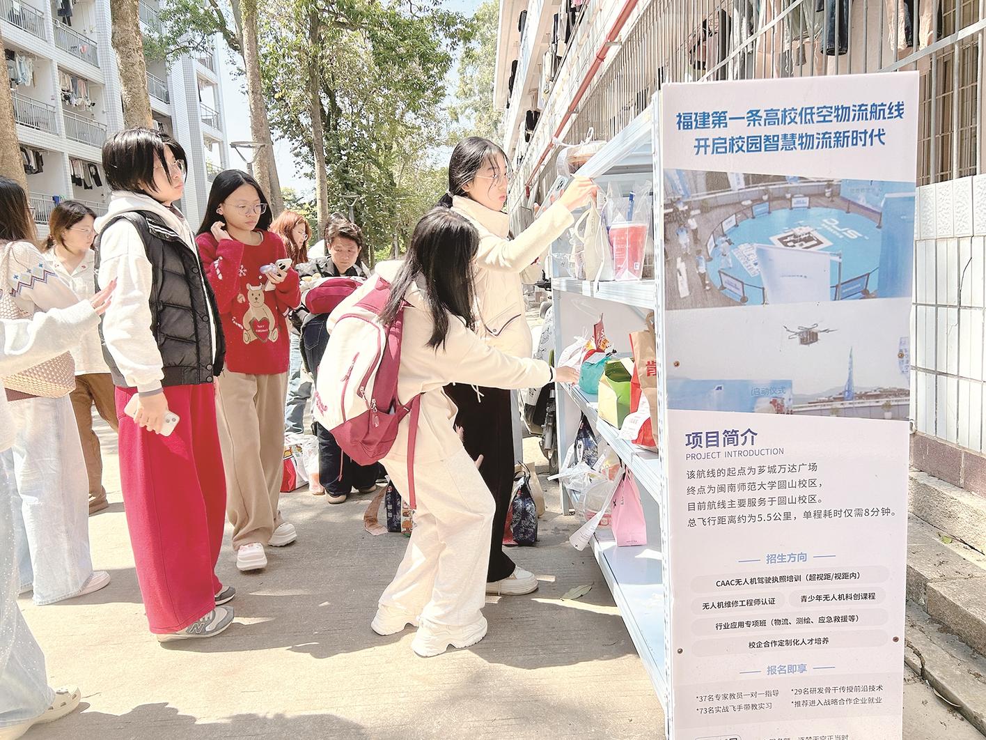 上午11:30,午餐高峰来临。闽南师大圆山校区停机坪前,大一学生田爽爽仰头望向天空,等待着那架熟悉的白色无人机。