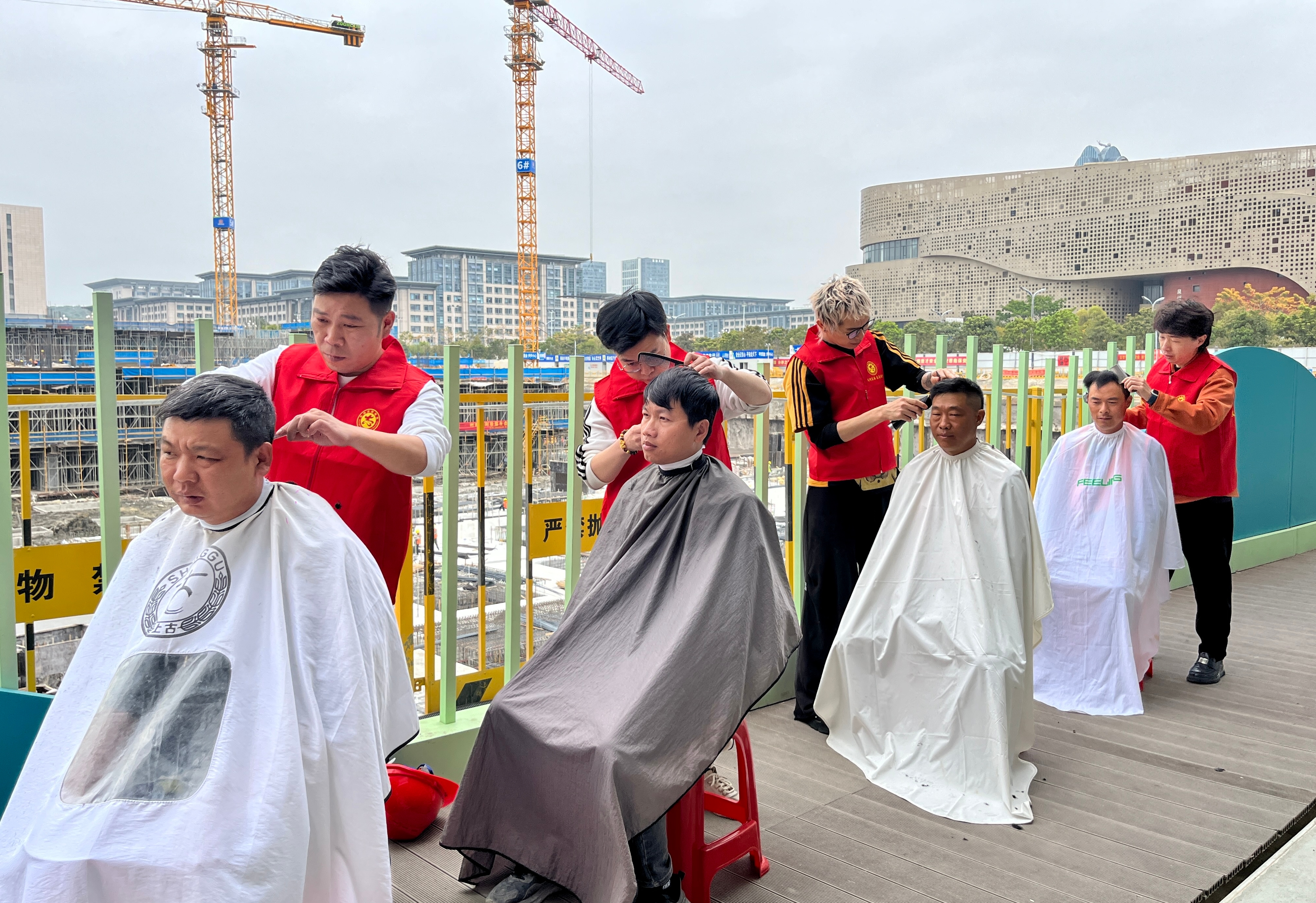 “平时忙着赶工期,根本没时间去理发店,今天能在工地免费理发,感觉特别暖心!”钢筋工老李说。在只有几张椅子、几张桌布的临时“理发店”里,滨海社区的4名专业理发志愿者马不停蹄,为81位工人提供了免费理发服务,为他们剪去疲惫,剪出环湾建设的精气神。